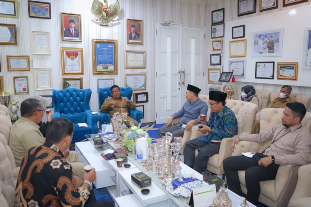 Banda Aceh – Wali Kota Banda Aceh yang juga Ketua Umum Masyarakat Ekonomi Syariah (MES) Provinsi Aceh Aminullah Usman SEAk MM menyambut kunjungan Sekretaris 3 MES Pusat Dr Moch Bukhori Muslim Lc MA di pendopo, Selasa 14 Desember 2021. Dalam pertemuan silaturahmi tersebut, Aminullah turut didampingi oleh Sekum MES Aceh Sugito.