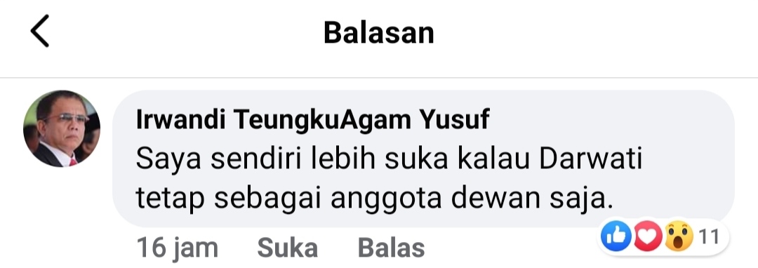 Lantas apa kata Irwandi Yusuf, terkait wacana istrinya menjadi calon Wagub. Melalui akun media sosialnya, Irwandi mengaku lebih suka jika Darwati sebagai anggota DPRA saja.