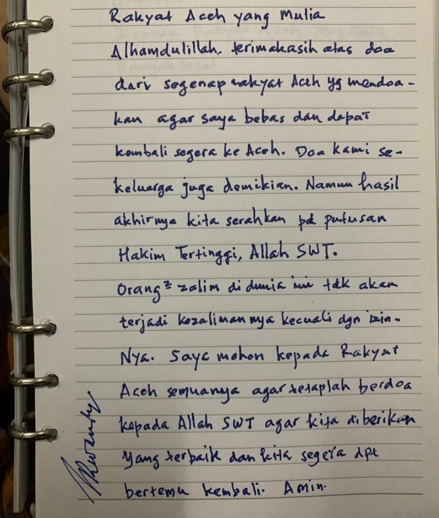 Banda Aceh - Gubernur Aceh non aktif, Irwandi Yusuf menuliskan selembar surat yang ditulis tangan untuk rakyat Aceh.