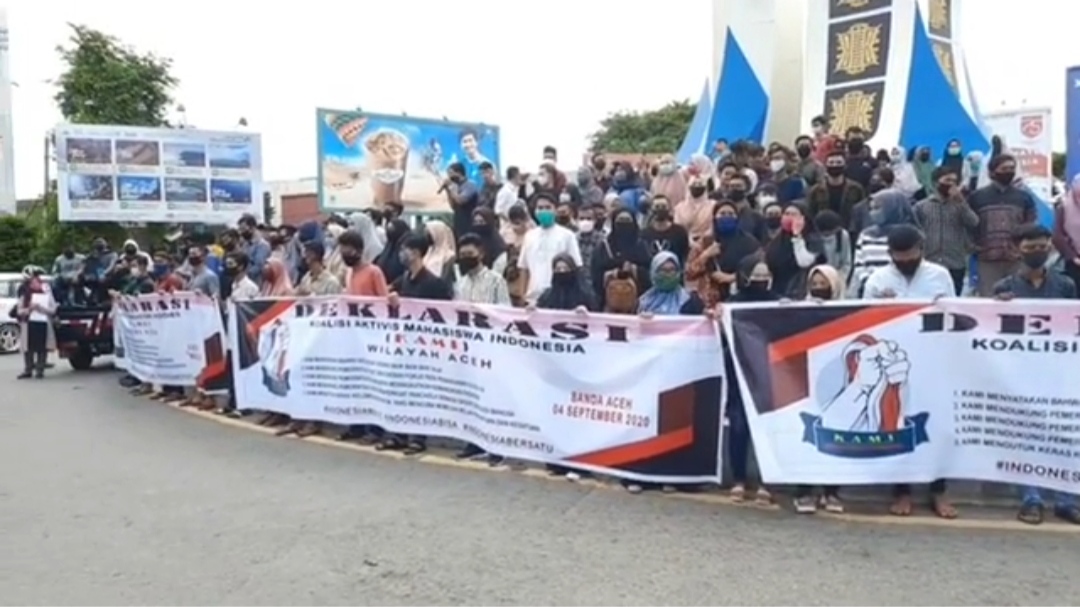 Banda Aceh - Ratusan mahasiswa dari berbagai organisasi kemahasiswaan di Aceh melakukan aksi damai di Simpang Lima, Banda Aceh (4/09/2020).