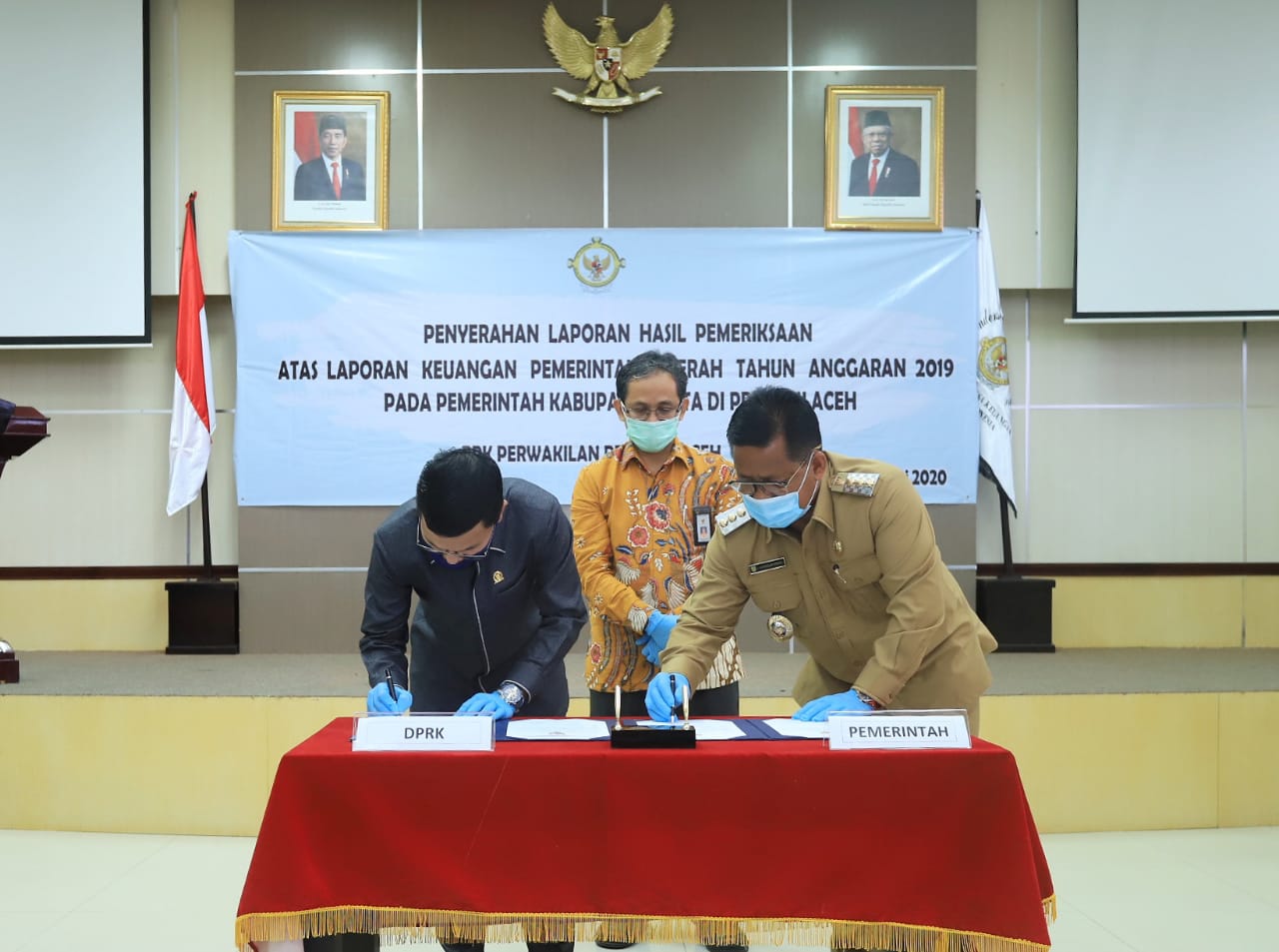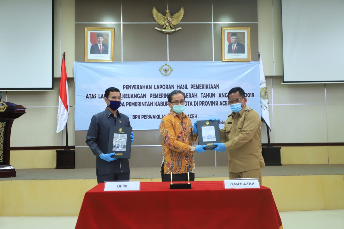 Penghargaan diserahkan langsung oleh Kepala BPK-RI Perwakilan Provinsi Aceh Arif Agus kepada Wali Kota Banda Aceh Aminullah Usman dan Ketua DPRK Farid Nyak Umar, Selasa 16 Juni 2020 di gedung BPK-RI Aceh.
