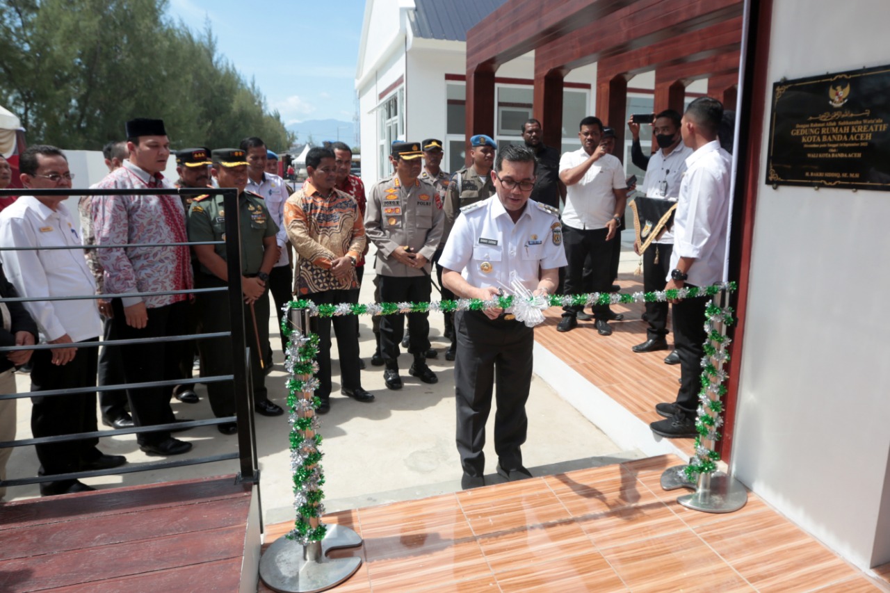 Banda Aceh – Penjabat Wali Kota Banda Aceh, Bakri Siddiq resmikan Rumah Kreatif Al Mahirah, Rabu, 14 September 2022, di lingkungan Pasar Al Mahirah Lamdingin. Peresmian ditandai dengan pemotongan pita dan penandatanganan prasasti oleh Bakri Siddiq.